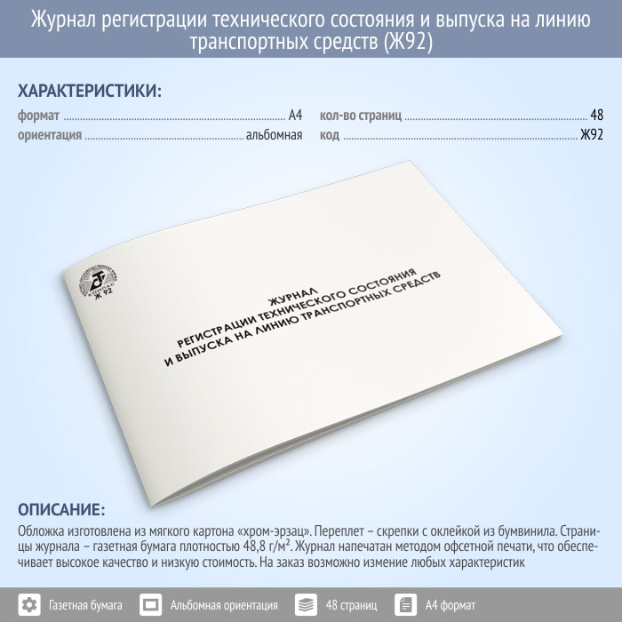 Журнал регистрации технического состояния и выпуска на линию транспортных средств (48 стр., Ж92) в Ульяновске купить