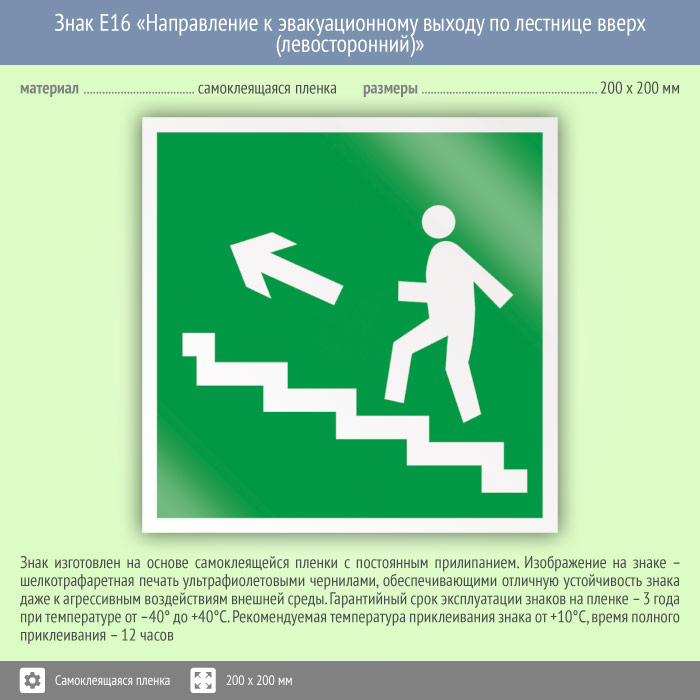 Знак «Направление к эвакуационному выходу по лестнице вверх (левосторонний)» указывает направление к выходу вверх по лестнице влево. Код знака: E16