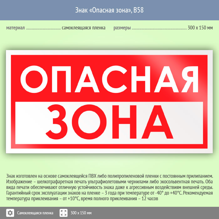 Знак «Опасная зона» имеет размер 300х150 мм