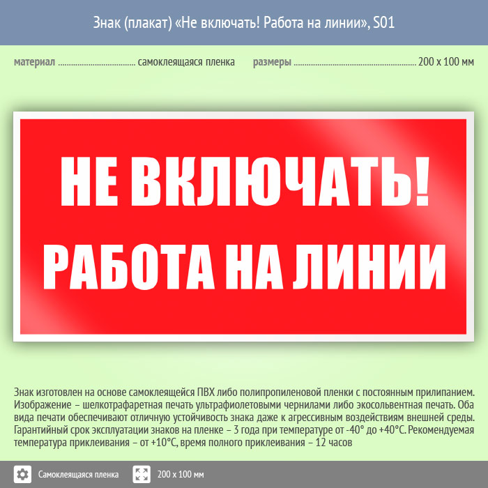 Знак «Не включать! Работа на линии» может быть изготовлен любого размера на самоклеящейся пленке, пластике толщиной 0.5, 2 или 4 мм и металле. Также возможно применение фотолюминесцентных и световозвращающих материалов