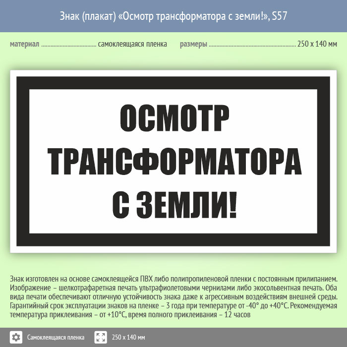 Знак (плакат) «Осмотр трансформатора с земли!», S57 (пленка, 250х140 мм)