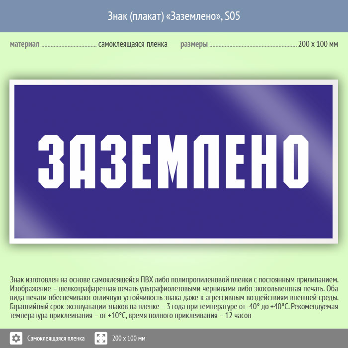 Знак (плакат) «Заземлено», S05 (пленка, 200х100 мм)