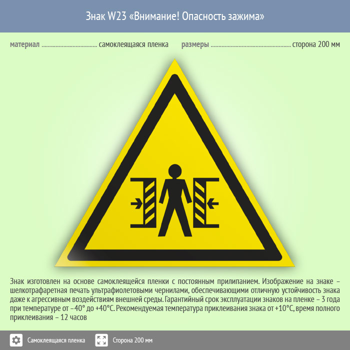 Знак «Внимание! Опасность зажима» имеет размер сторона 200 мм