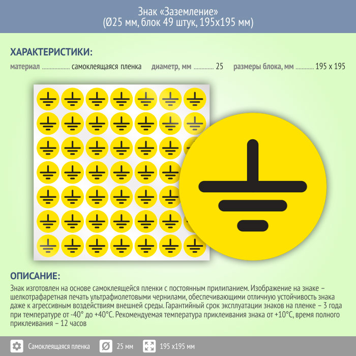 Знак (плакат) «Заземление», S46 (пленка, диаметр 25 мм, блок 49 штук, 195х195 мм) в Ульяновске купить