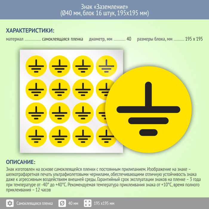 Знак (плакат) «Заземление», S46 (пленка, диаметр 40 мм, блок 16 штук, 195х195 мм) в Ульяновске купить