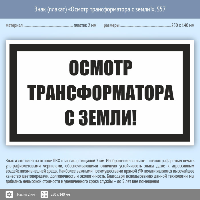 Знак (плакат) «Осмотр трансформатора с земли!», S57 (пластик, 250х140 мм) в Ульяновске купить