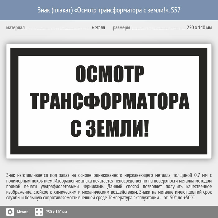 Знак (плакат) «Осмотр трансформатора с земли!», S57 (металл, 250х140 мм) в Ульяновске купить