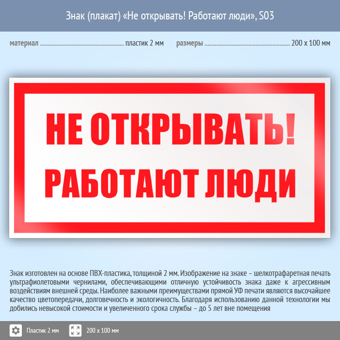 Знак (плакат) «Не открывать! Работают люди», S03 (пластик, 200х100 мм) в Ульяновске купить