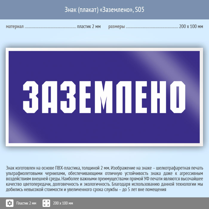Знак (плакат) «Заземлено», S05 (пластик, 200х100 мм) в Ульяновске купить