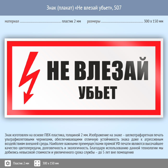 Знак (плакат) «Не влезай убьет», S07 (пластик, 300х150 мм) в Ульяновске купить