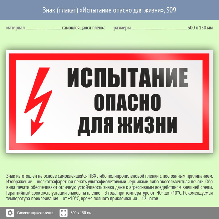 Знак (плакат) «Испытание опасно для жизни», S09 (пленка, 300х150 мм) в Ульяновске купить