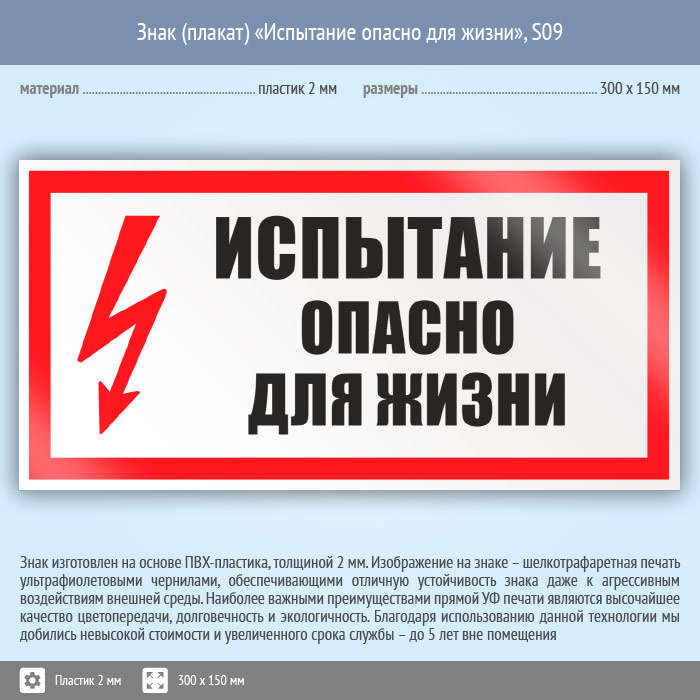 Знак (плакат) «Испытание опасно для жизни», S09 (пластик, 300х150 мм) в Ульяновске купить