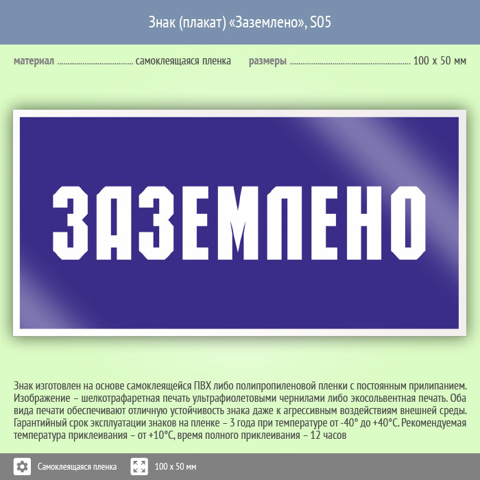 Знак (плакат) «Заземлено», S05 (пленка, 100х50 мм) в Ульяновске купить