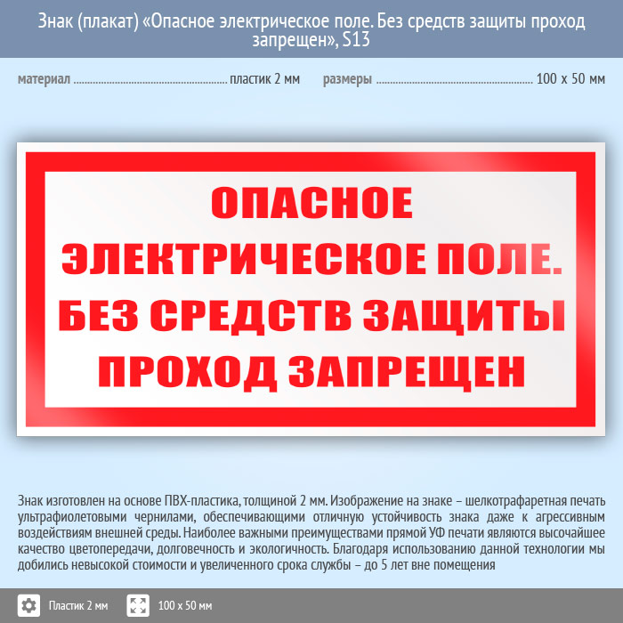 Знак (плакат) «Опасное электрическое поле. Без средств защиты проход запрещен», S13 (пластик, 100х50 мм) в Ульяновске купить