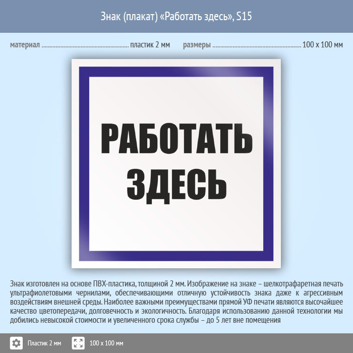 Знак (плакат) «Работать здесь», S15 (пластик, 100х100 мм) в Ульяновске купить