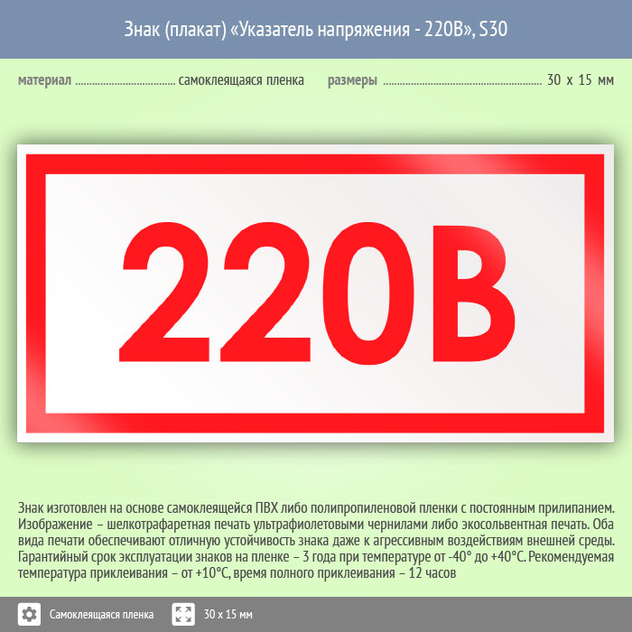 Знак (плакат) «Указатель напряжения - 220В», S30 (50 штук, пленка, 30х15 мм) в Ульяновске купить