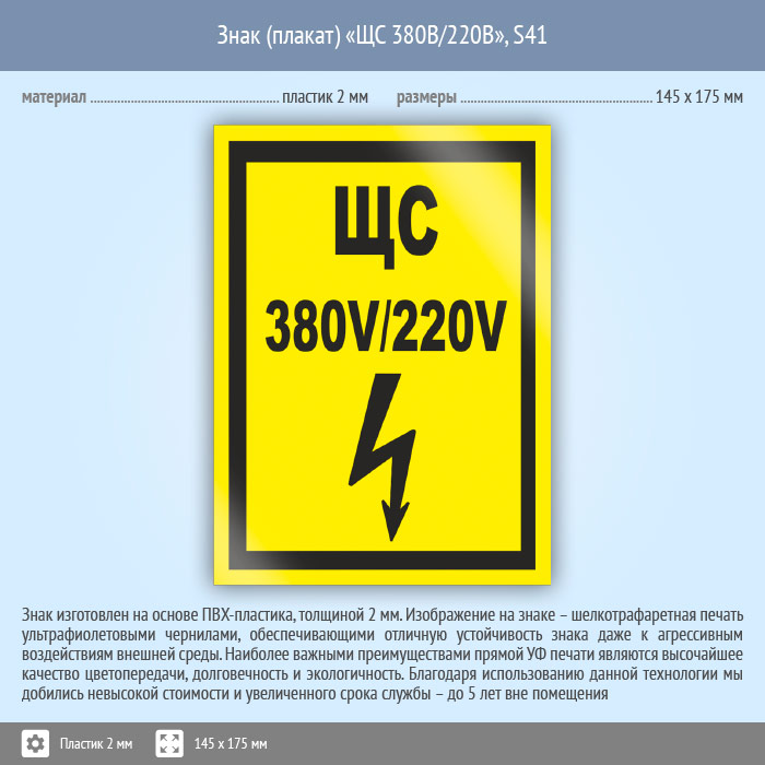 Знак (плакат) «ЩС 380В/220В», S41 (пластик, 145х175 мм) в Ульяновске купить
