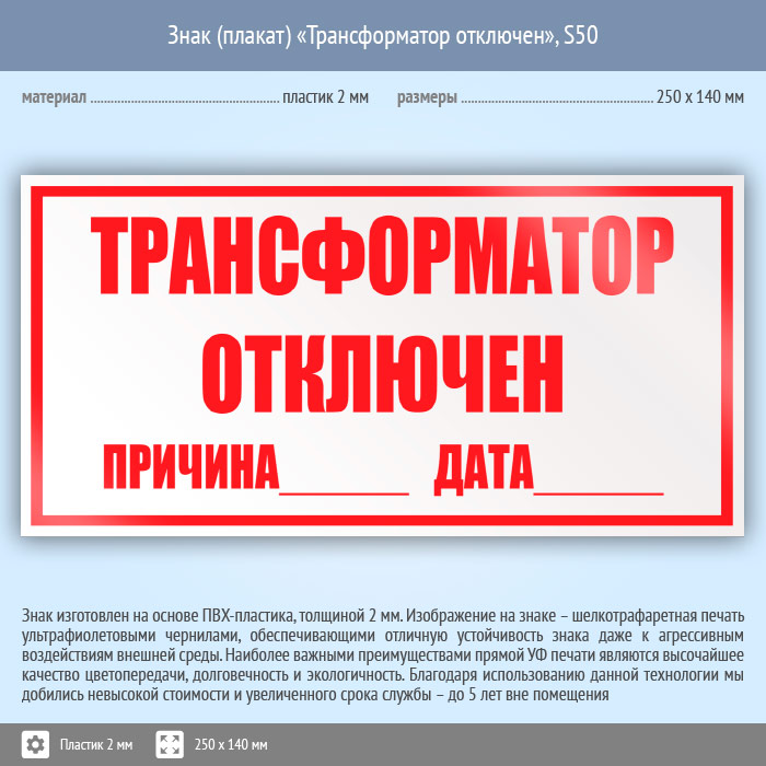 Знак (плакат) «Трансформатор отключен», S50 (пластик, 250х140 мм) в Ульяновске купить