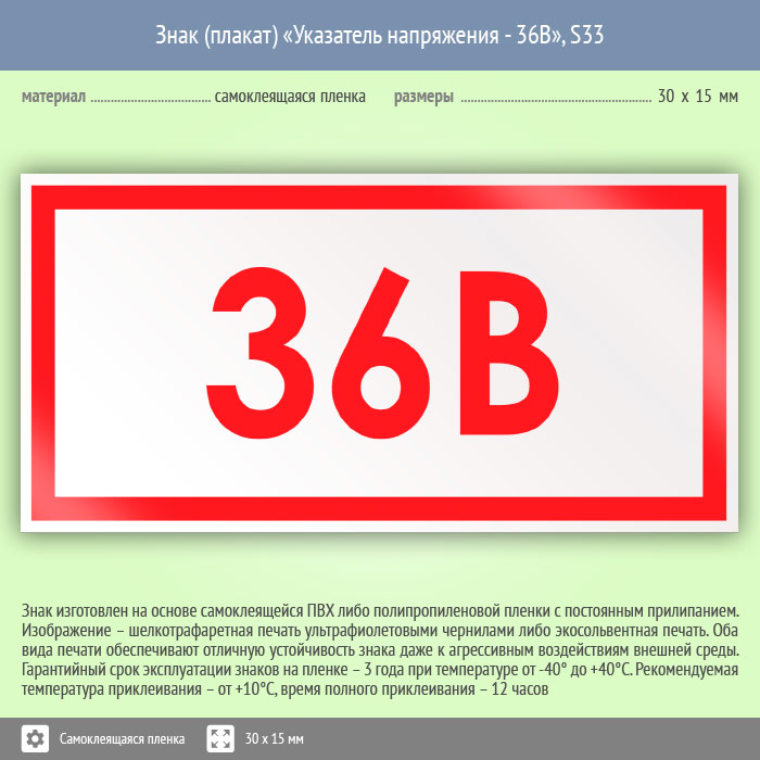 Знак (плакат) «Указатель напряжения - 36В», S33 (50 штук, пленка, 30х15 мм) в Ульяновске купить