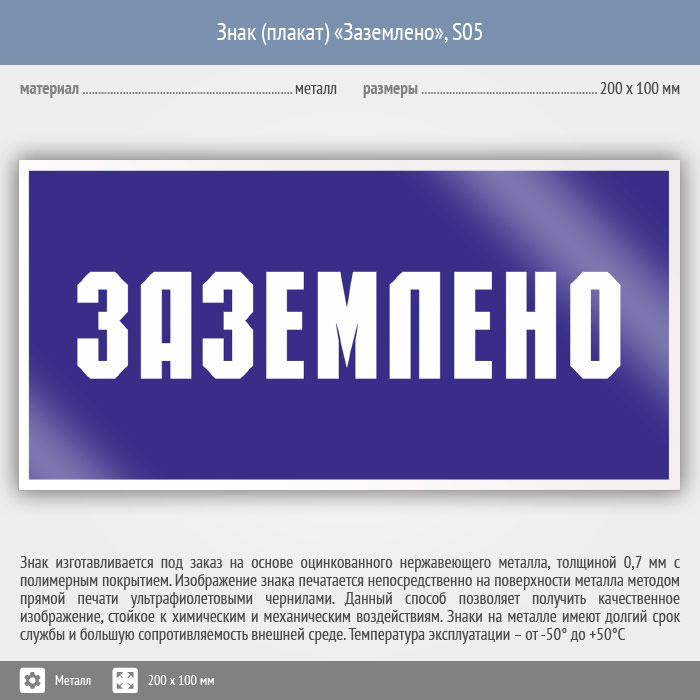 Знак (плакат) «Заземлено», S05 (металл, 200х100 мм) в Ульяновске купить