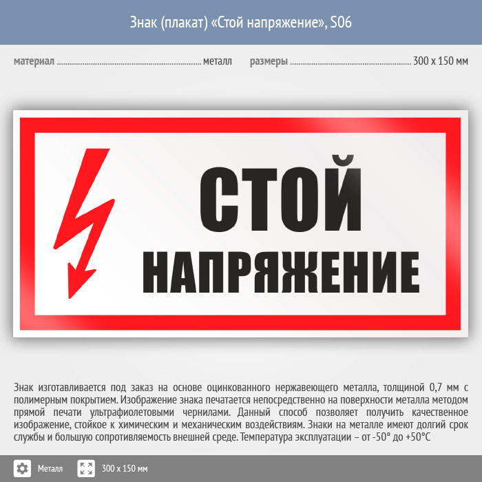 Знак (плакат) «Стой напряжение», S06 (металл, 300х150 мм) в Ульяновске купить