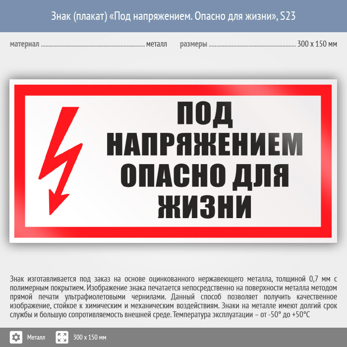Знак (плакат) «Под напряжением. Опасно для жизни», S23 (металл, 300х150 мм) в Ульяновске купить