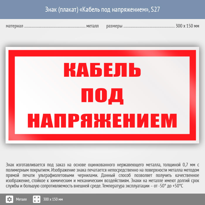 Знак (плакат) «Кабель под напряжением», S27 (металл, 300х150 мм) в Ульяновске купить