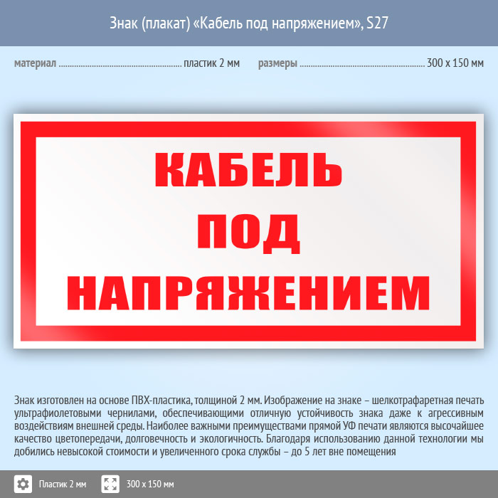 Знак (плакат) «Кабель под напряжением», S27 (пластик, 300х150 мм) в Ульяновске купить