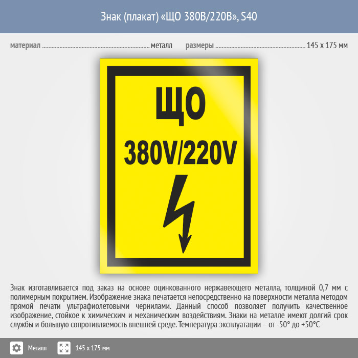 Знак (плакат) «ЩО 380В/220В», S40 (металл, 145х175 мм) в Ульяновске купить