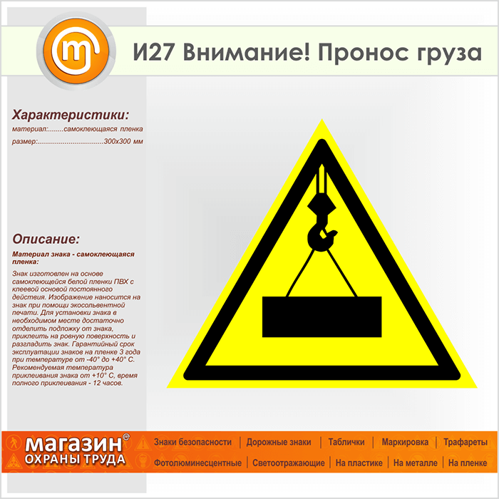 Знак «Внимание! Пронос груза», И27 (пленка, сторона 300 мм) в Ульяновске купить