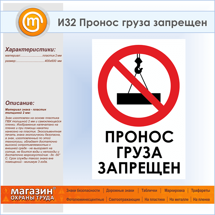 Знак «Пронос груза запрещен», И32 (пластик, 400х600 мм) в Ульяновске купить
