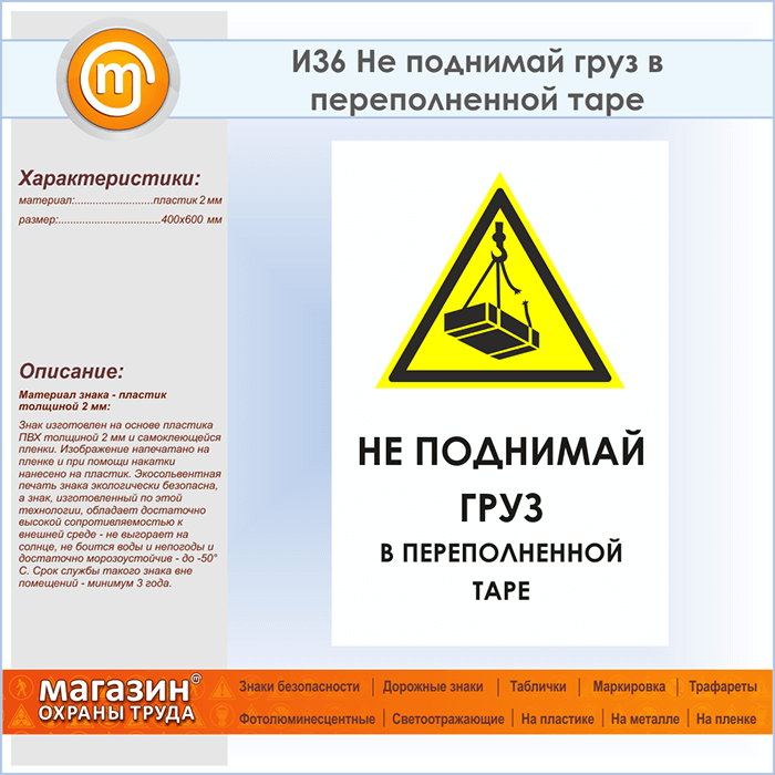 Знак «Не поднимай груз в переполненной таре», И36 (пластик, 400х600 мм) в Ульяновске купить