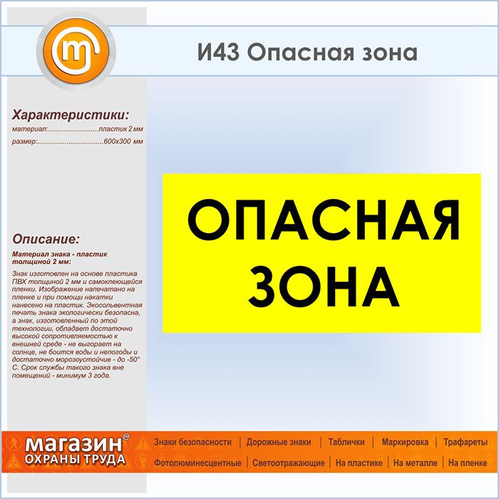 Знак «Опасная зона», И43 (пластик, 600х300 мм) в Ульяновске купить