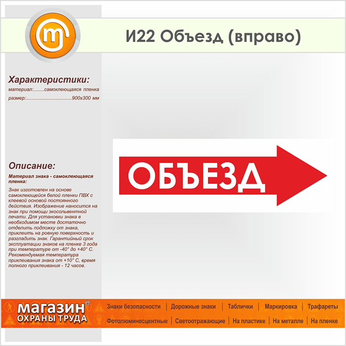 Знак «Объезд (вправо)», И22 (пленка, 900х300 мм) в Ульяновске купить