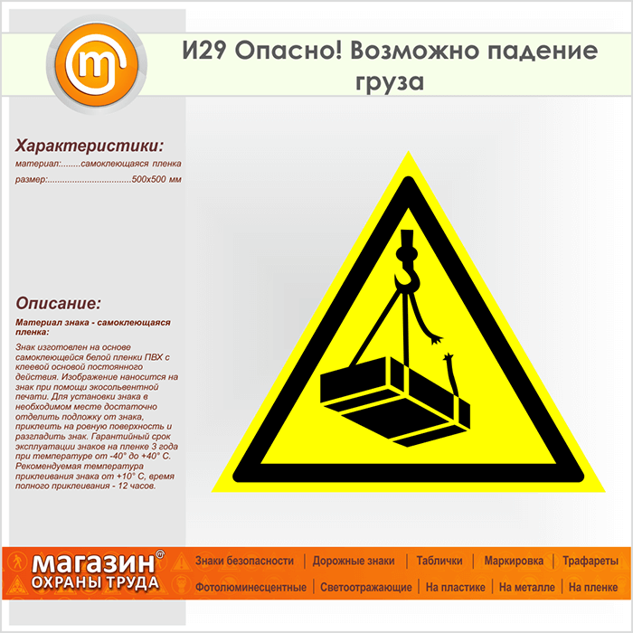 Знак «Опасно! Возможно падение груза», И29 (пленка, сторона 500 мм) в Ульяновске купить