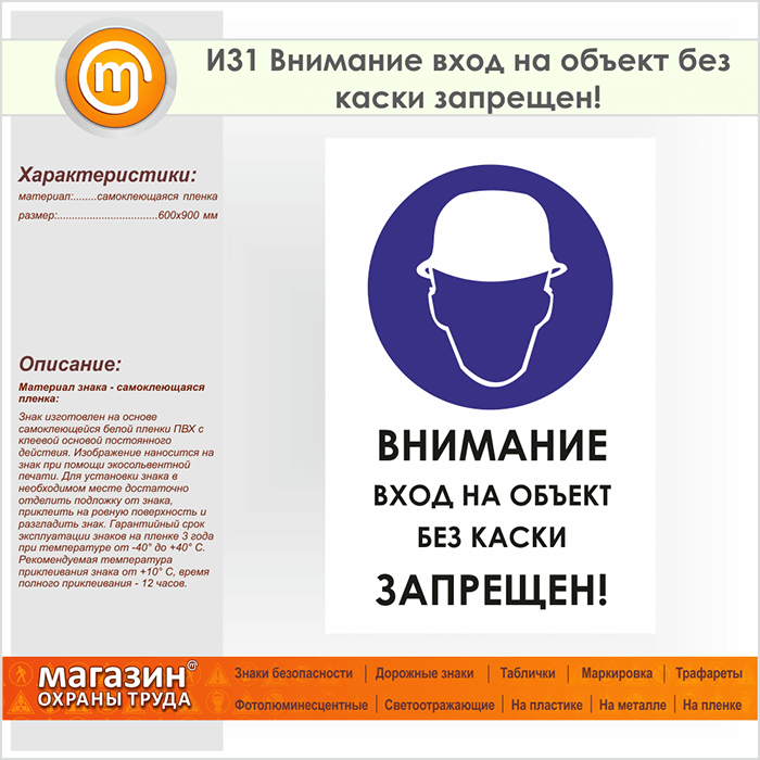 Знак «Внимание вход на объект без каски запрещен!», И31 (пленка, 600х900 мм) в Ульяновске купить