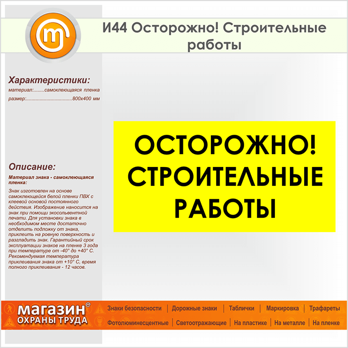Знак «Осторожно! Строительные работы», И44 (пленка, 800х400 мм) в Ульяновске купить