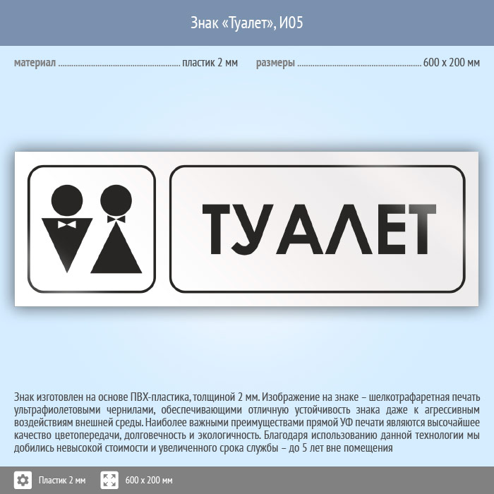 Знак «Туалет», И05 (пластик, 600х200 мм) в Ульяновске купить