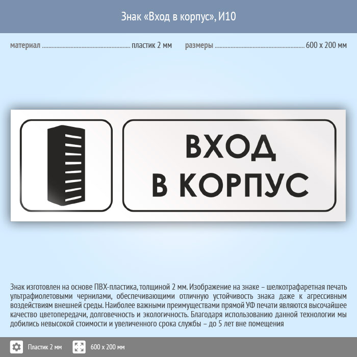 Знак «Вход в корпус», И10 (пластик, 600х200 мм) в Ульяновске купить