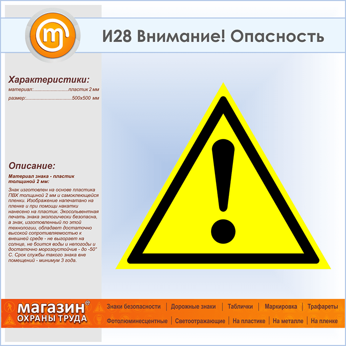 Знак «Внимание! Опасность», И28 (пластик, сторона 500 мм) в Ульяновске купить