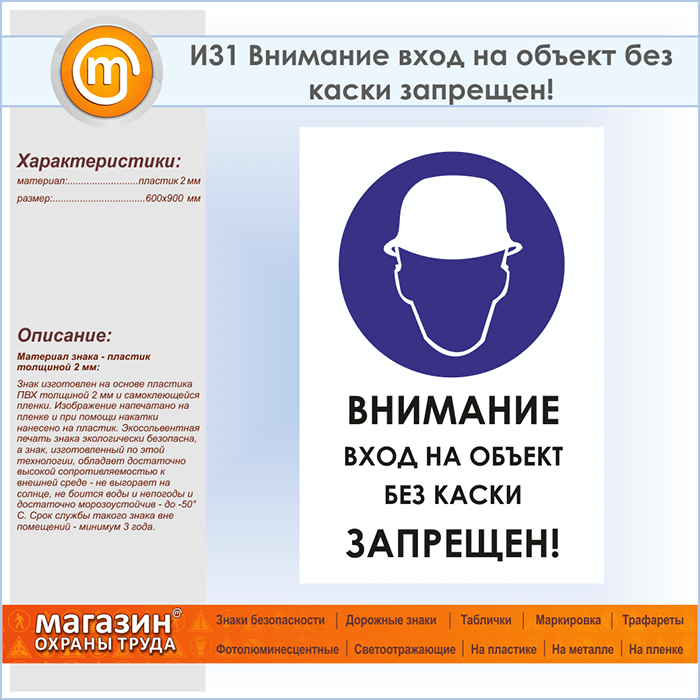 Знак «Внимание вход на объект без каски запрещен!», И31 (пластик, 600х900 мм) в Ульяновске купить
