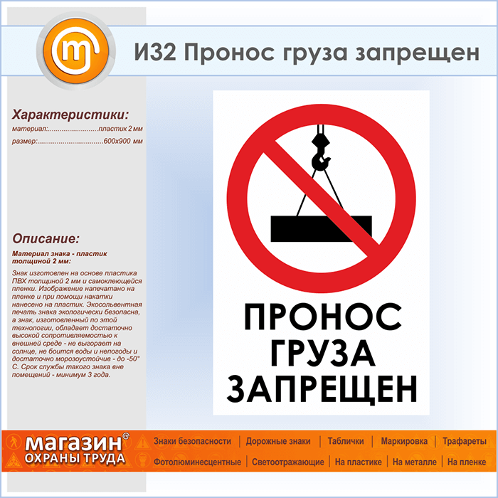 Знак «Пронос груза запрещен», И32 (пластик, 600х900 мм) в Ульяновске купить