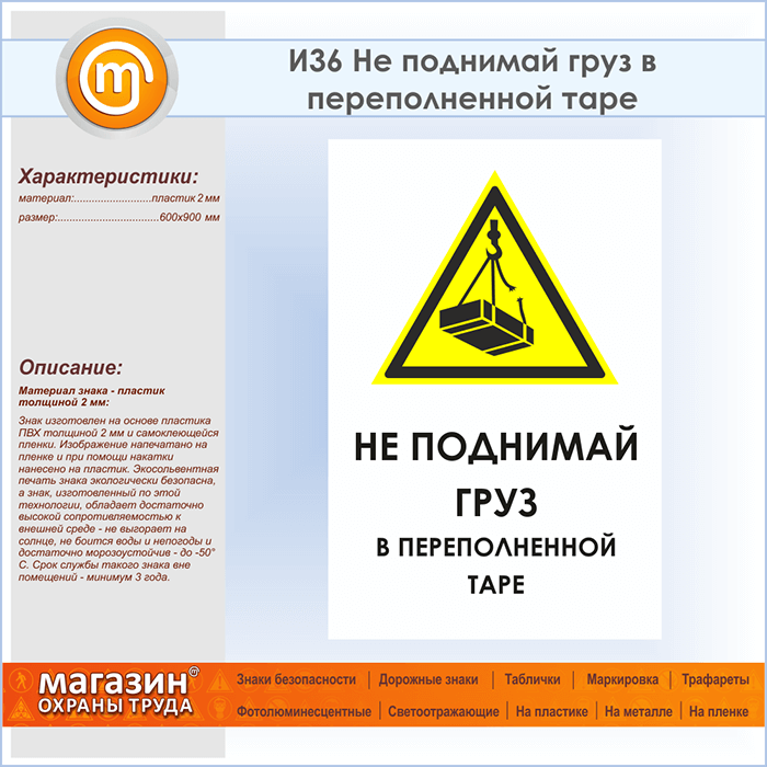Знак «Не поднимай груз в переполненной таре», И36 (пластик, 600х900 мм) в Ульяновске купить