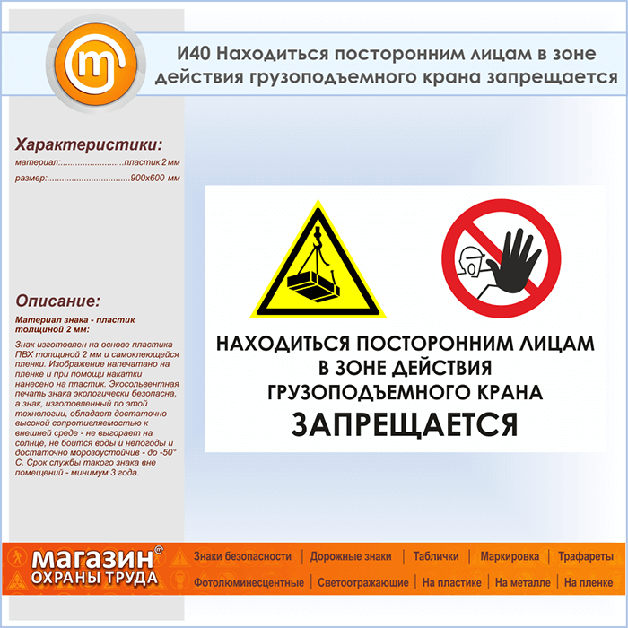 Знак «Находиться посторонним лицам в зоне действия грузоподъемного крана запрещается», И40 (пластик, 900х600 мм) в Ульяновске купить
