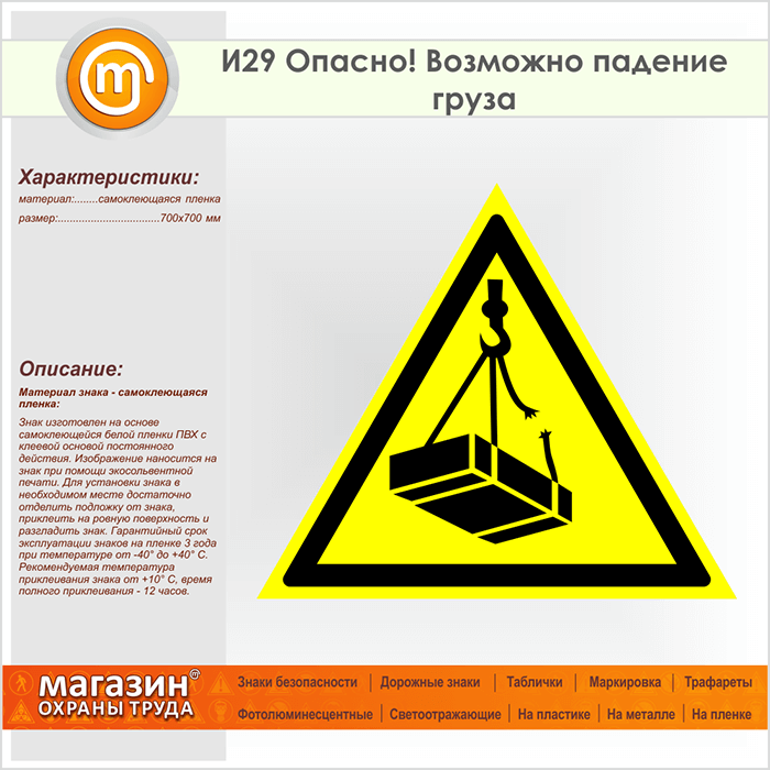 Знак «Опасно! Возможно падение груза», И29 (пленка, сторона 700 мм) в Ульяновске купить