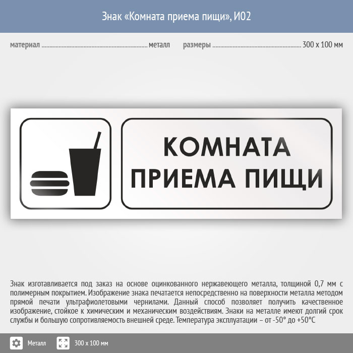 Знак «Комната приема пищи», И02 (металл, 300х100 мм) в Ульяновске купить