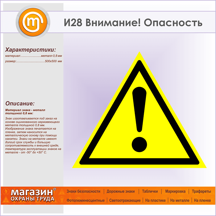 Знак «Внимание! Опасность», И28 (металл, сторона 500 мм) в Ульяновске купить