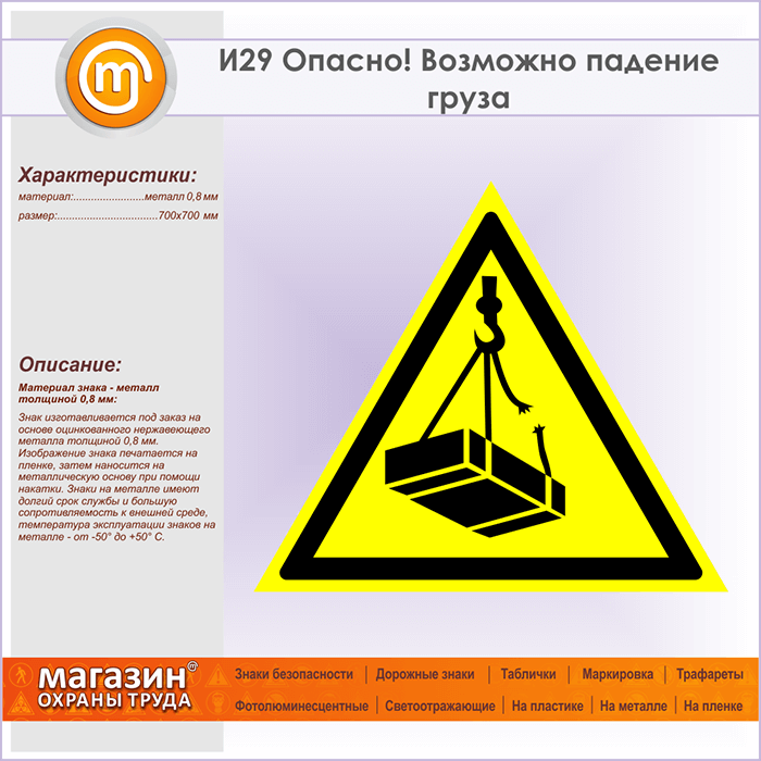 Знак «Опасно! Возможно падение груза», И29 (металл, сторона 700 мм) в Ульяновске купить