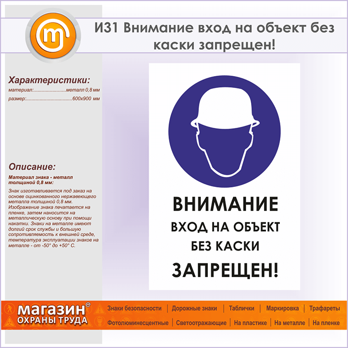 Знак «Внимание вход на объект без каски запрещен!», И31 (металл, 600х900 мм) в Ульяновске купить
