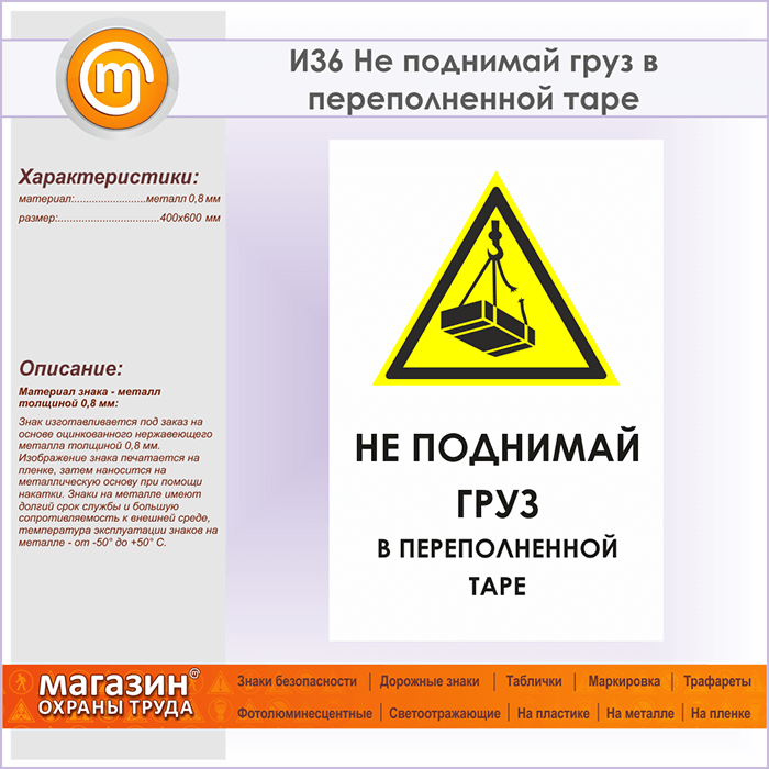 Знак «Не поднимай груз в переполненной таре», И36 (металл, 400х600 мм) в Ульяновске купить